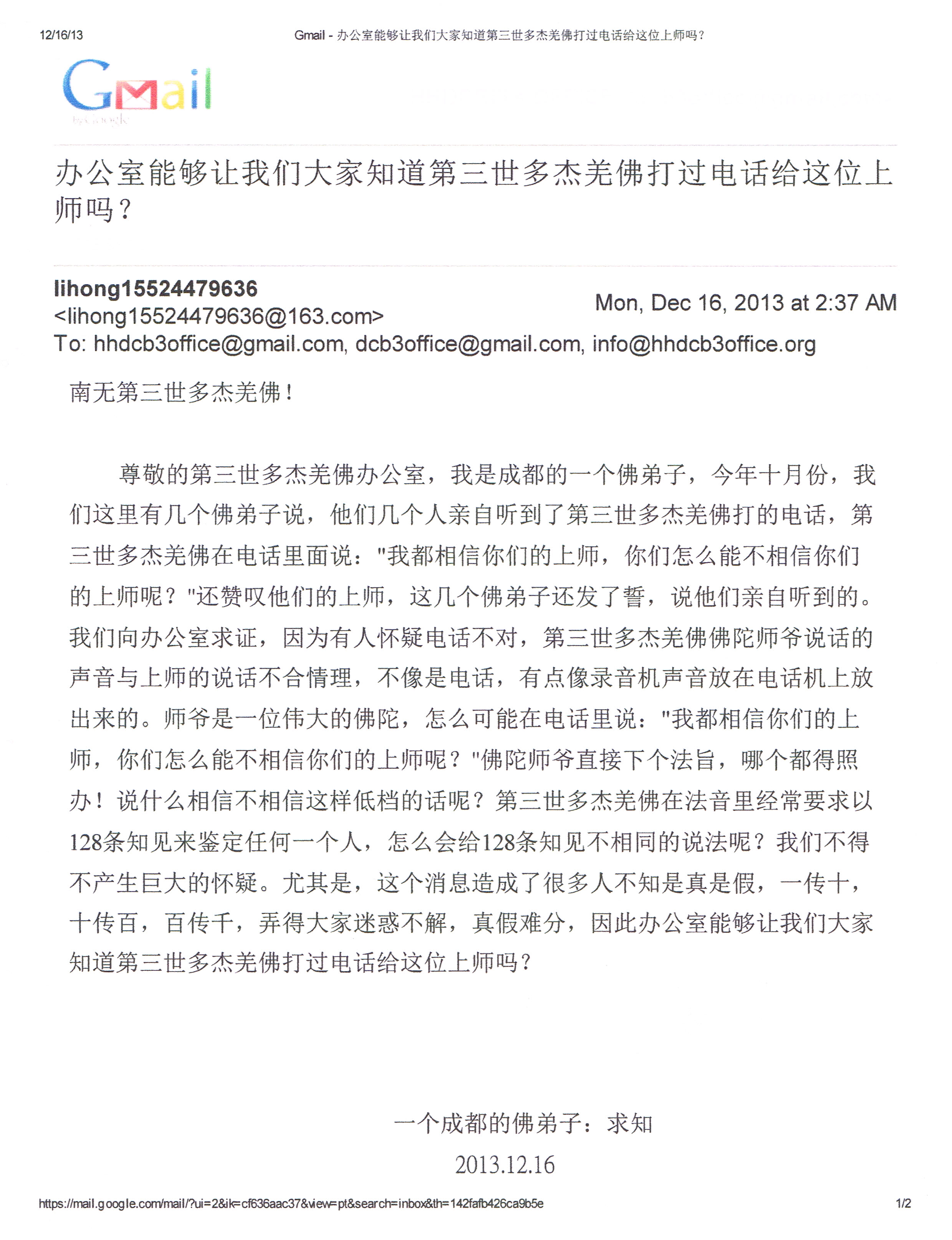 第一號來函印證 (12/17/2013) H.H.第三世多杰羌佛是給中國的一個弟子在2013年10月14日通過電話。 事情緣於當天晚上九點四十八分,也就是中國時間10月15日中午十二點四十八分的時候,辦公室給中國的一位弟子去電話諮詢情況,電話掛斷以後,H.H.第三世多杰羌佛又讓辦公室人員再次給這位弟子打通電話,H.H.第三世多杰羌佛親自給這位弟子講了電話。在電話中,這位弟子向H.H.第三世多杰羌佛作懺悔說:過去錯了,從現在開始,重新和同學們一起聞法,聞法點只會增加,不會減少。H.H.第三世多杰羌佛在電話中告訴他:“你能這樣,我為你高興,知錯能改,才是真修行,人生無常,要按佛法戒規修行,要利益眾生,要清楚,佛菩薩的世界中沒有一個不符合佛菩薩行為的人,合格的人才過得了擇決關,我會教你的佛法。”這是2013年H.H.第三世多杰羌佛和這位弟子唯一的一次通話和內容,也是2013年H.H.第三世多杰羌佛通往中國的唯一一次電話。